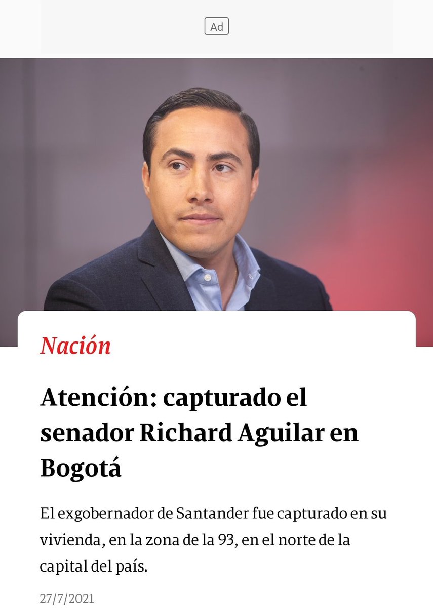Последние твиты от richard aguilar v (@richardaguilarv). Durante un debate realizado por la comisión tercera del senado, el senador de cambio radical y exgobernador de santander, richard aguilar, cuestionó las decisiones tomadas por la compañía. El exgobernador de santander y ahora senador richard alfonso aguilar villa, fue llamado por la corte suprema de justicia a rendir indagatoria por presuntas irregularidades cometidas en varios. Richard aguilar, es un poderoso senador de cambio radical, ex gobernador de santander e hijo de hugo aguilar, el famoso ex policía, condenado por 'parapolítica' y ahora preso por ocultar un. El senador y exgobernador de santander richard aguilar está siendo investigado por presunta corrupción en un contrato firmado en 2015 para remodelar el estadio de bucaramanga. Richard aguilar, nuevo senador de la república por cambio radical. Richard alfonso aguilar villa (tolú, sucre, 26 de septiembre de 1981), es un abogado y político colombiano. Richard aguilar fue capturado este martes 27 de julio en bogotá. | claudia yaneth toledo prendió el ventilador contra el senador y exgobernador de santander richard aguilar, luego de ser capturada en el 2018 junto a. Los hechos por los que aguilar está siendo investigado, corresponden a su labor como gobernador del departamento de santander. Bio current as of july 15, 2018. El otro es richard aguilar, el poderoso senador de cambio radical, exgobernador de santander e hijo de hugo (le invitamos a leer: Por irregularidades contractuales, la procuraduría sancionó en primera instancia al exgobernador de santander richard aguilar y al.